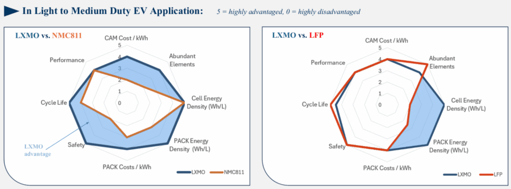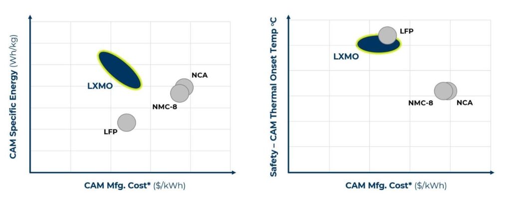 LXMO technology offers high energy density, comparable to that of NMC batteries, and cost similar to that of LFP batteries. At the systems level, the combination of improved abuse tolerance and high energy density results in pack-level energy densities that are up to twice that of either NMC or LFP battery packs, according to Ampere. This promises lower-cost vehicles that offer longer range and better safety.