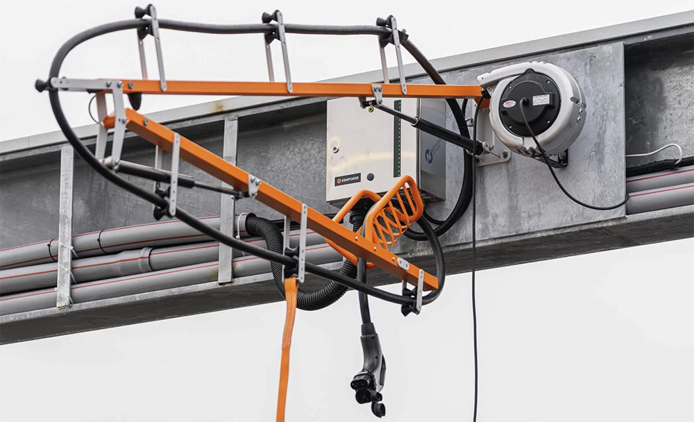 A total of 16 charging points are now in service at the logistics center, including 14 Kempower Control Units equipped with 14 Kempower Cable Arms, and two Kempower Liquid-Cooled Satellites for high-power fast charging.