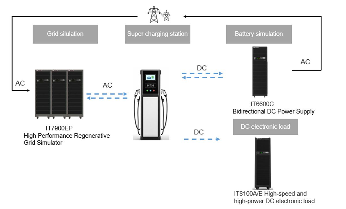 Engineers often use grid simulator such as the ITECH IT7900EP combined with bidirectional DC power supply like the IT6600C to reproduce real-world grid behavior and emulate vehicle-side conditions.